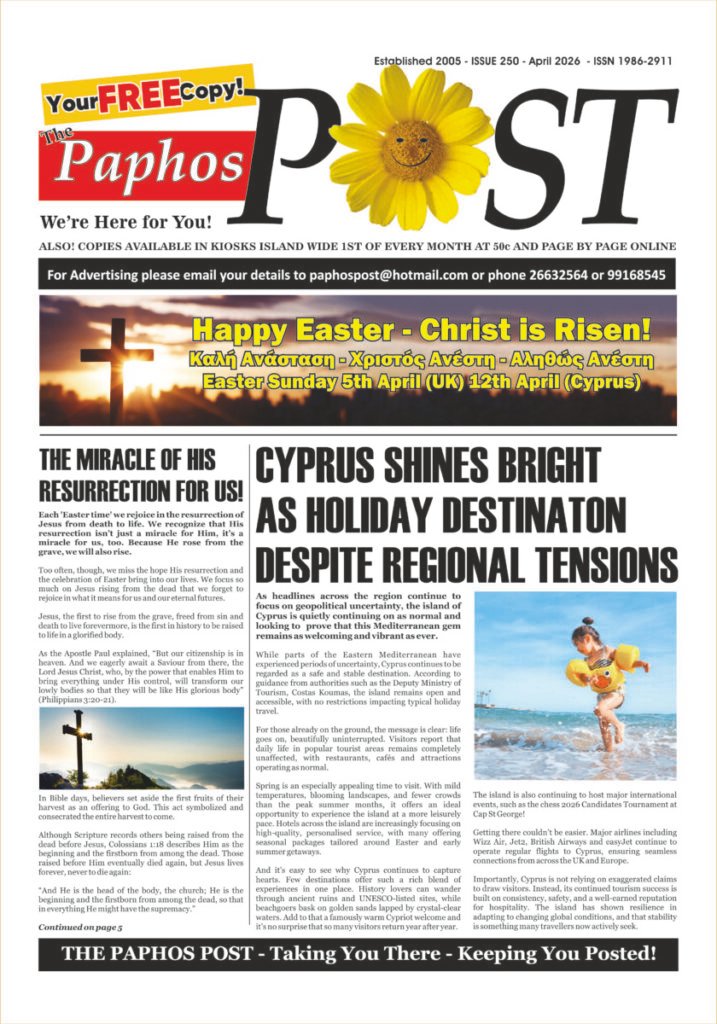 Paphos Post April Issue Out Now Paphos Post April Issue Out Now April 2, 2026 Pick up your copy today! Easter events, local news, sports updates and so much more!