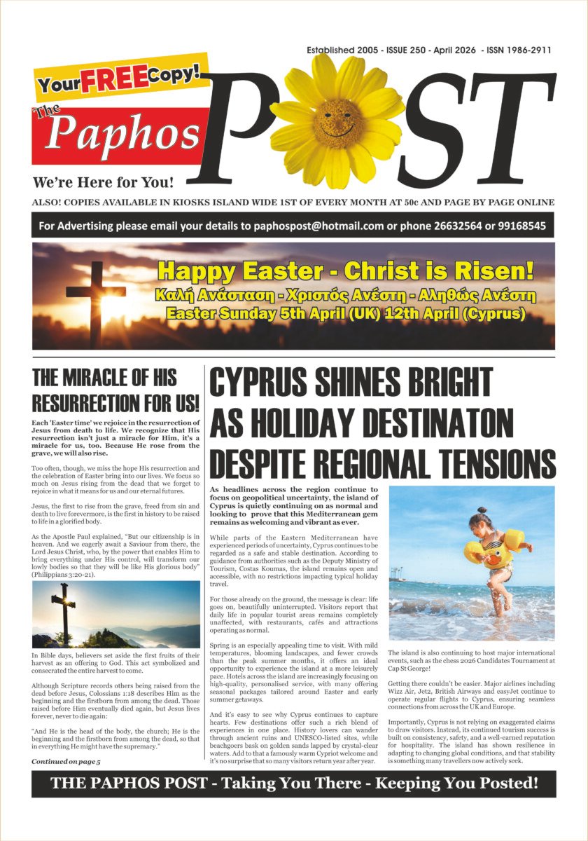 Paphos Post April Issue Out Now April 2, 2026 Pick up your copy today! Easter events, local news, sports updates and so much more! Published in New Issue CyprusLiving in Cyprusliving in paphosLocal news in PaphosNews in PaphosPaphosPaphos CommunityPaphos Postthe paphos postWhat's happening in Paphos Paphos Post More from New IssueMore posts in New Issue »March 2026 Issue is OUT NOWMarch 2026 Issue is OUT NOWPaphos Post February 2026 Issue is OUT NOW!!Paphos Post February 2026 Issue is OUT NOW!!Paphos Post January 2026 issue OUT NOW!Paphos Post January 2026 issue OUT NOW!December Christmas Issue of the Paphos Post – OUT NOW!!December Christmas Issue of the Paphos Post – OUT NOW!!Paphos Post November issue OUT NOW!Paphos Post November issue OUT NOW!